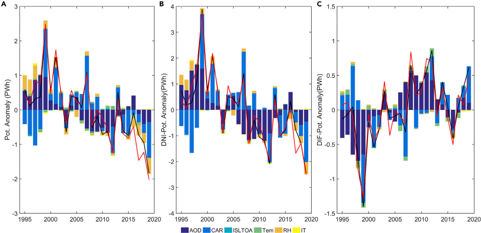 图2 中国大陆总潜力(A)、直射潜力(B)与散射潜力(C)变动性(当年潜力相对于25年平均潜力变化)的驱动因素分解。红色折线代表潜力评估模型输出的总潜力值,黑色折线代表统计模型输出的影响因素驱动力的叠加值。