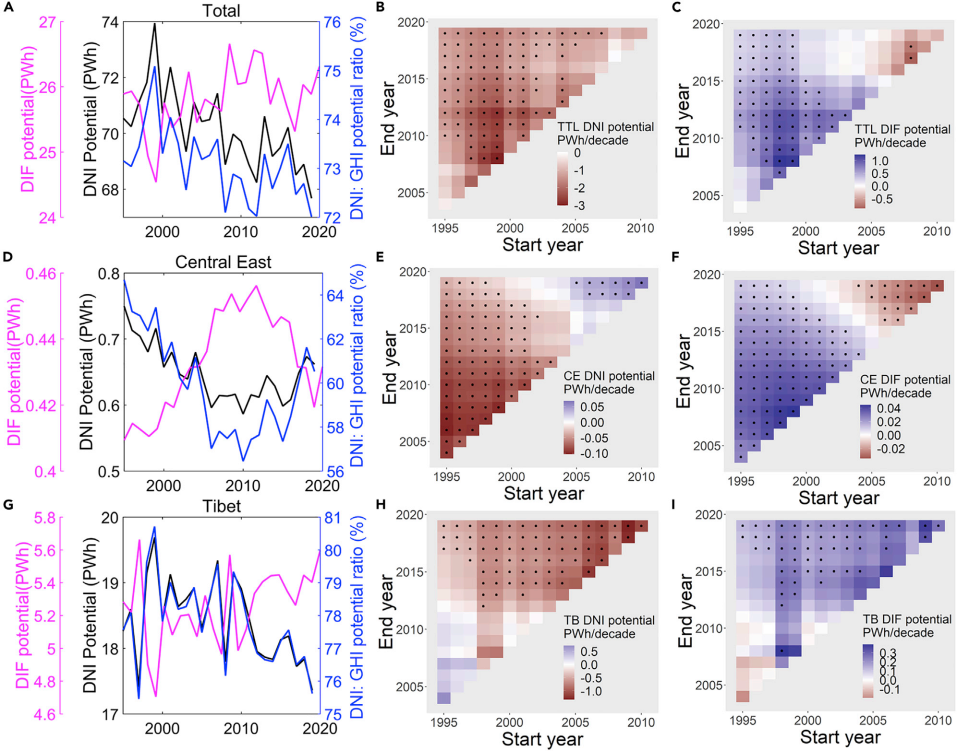 图1 中国大陆(A、B、C)及华东电网(D、E、F)和西藏电网(G、H、I)直射(DNI)潜力与散射(DIF)潜力的时间演变及趋势。格点颜色代表从起始年(横坐标)到终末年(纵坐标)的潜力变化趋势,黑色点状标记代表该趋势统计显著