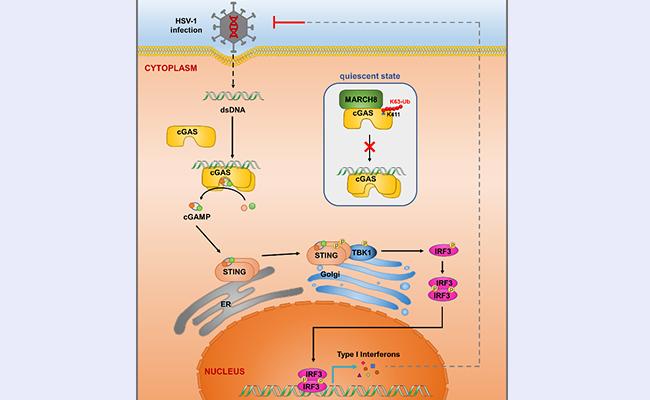 细胞DNA识别受体环鸟苷酸-腺苷酸合成酶(cGAS)及其介导的cGAS-STING-IFN信号通路天然免疫应答反应在抗病毒感染和肿瘤免疫中发挥重要作用。机体适当的免疫反应可以维持免疫稳态,但cGAS的过度激活或功能缺陷会引发自身免疫性疾病如Aicardi-Goutieres综合征(AGS)和系统性红斑狼疮(SLE),以及HSV-1等病毒感染性疾病的发生。因此,cGAS的功能调控研究具有重要意义。泛素化修饰是蛋白翻译后修饰的重要形式,可参与调节蛋白的稳定性、酶活性、亚细胞定位和信号转导等。目前,针对cGAS泛素化修饰的功能调控形式仍然了解较少。