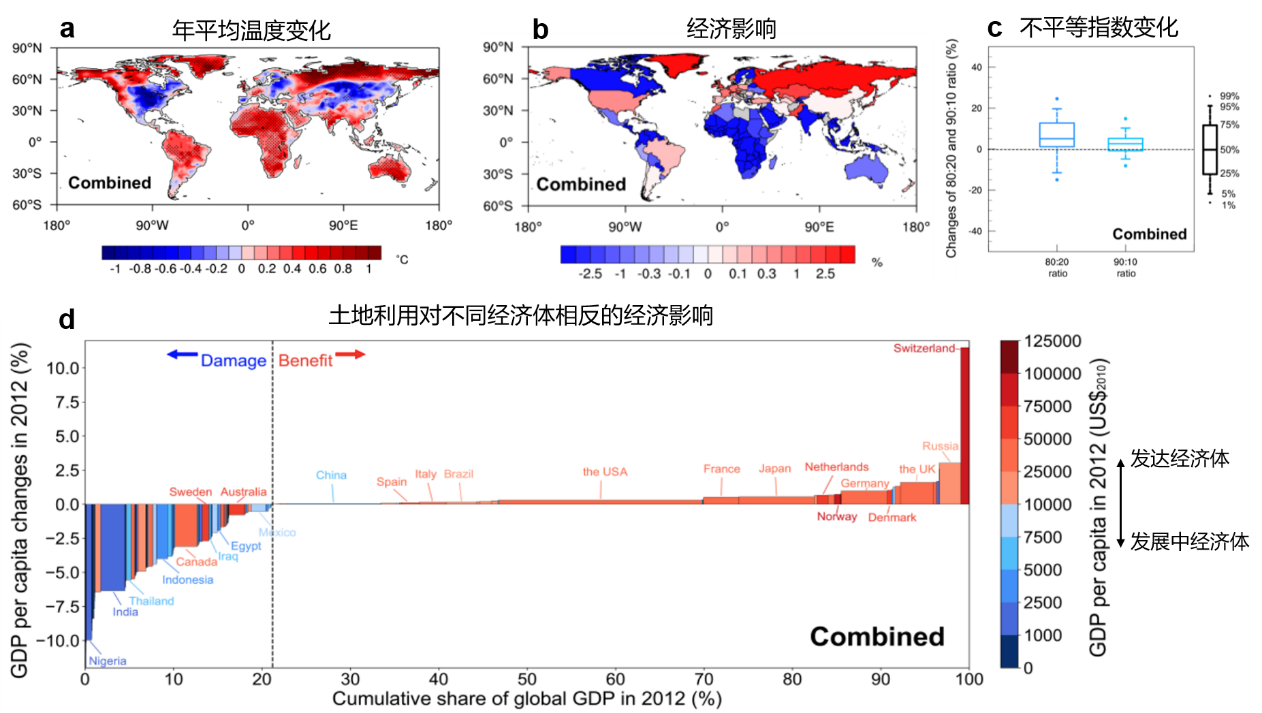 气候变化影响农业产量、能源供给、劳动生产以及人体健康等方方面面,进而影响宏观经济发展。此前观测研究证实,当一个国家的平均气温处于最佳温度范围时,人均GDP增长率最大;过高或过低的气温都不适宜经济发展。已有研究分析证实,温室气体和人为气溶胶排放会改变年平均温度进而影响全球经济。除了温室气体和人为气溶胶排放,由于人类日益增长的衣食住行需求,大范围的自然植被开垦为耕地、牧场及城市等人类用地,土地利用/覆盖变化(LULCC)也是人类活动影响气候变化的重要途径之一。土地利用既能产生生物地球物理效应(改变地表反照率、波文比等),又能产生生物地球化学效应(造成温室气体排放等),并且其生物地球物理效应又随扰动的地表类型和纬度不同而不同。因此,历史土地利用对全球气温、经济的影响仍不清楚。