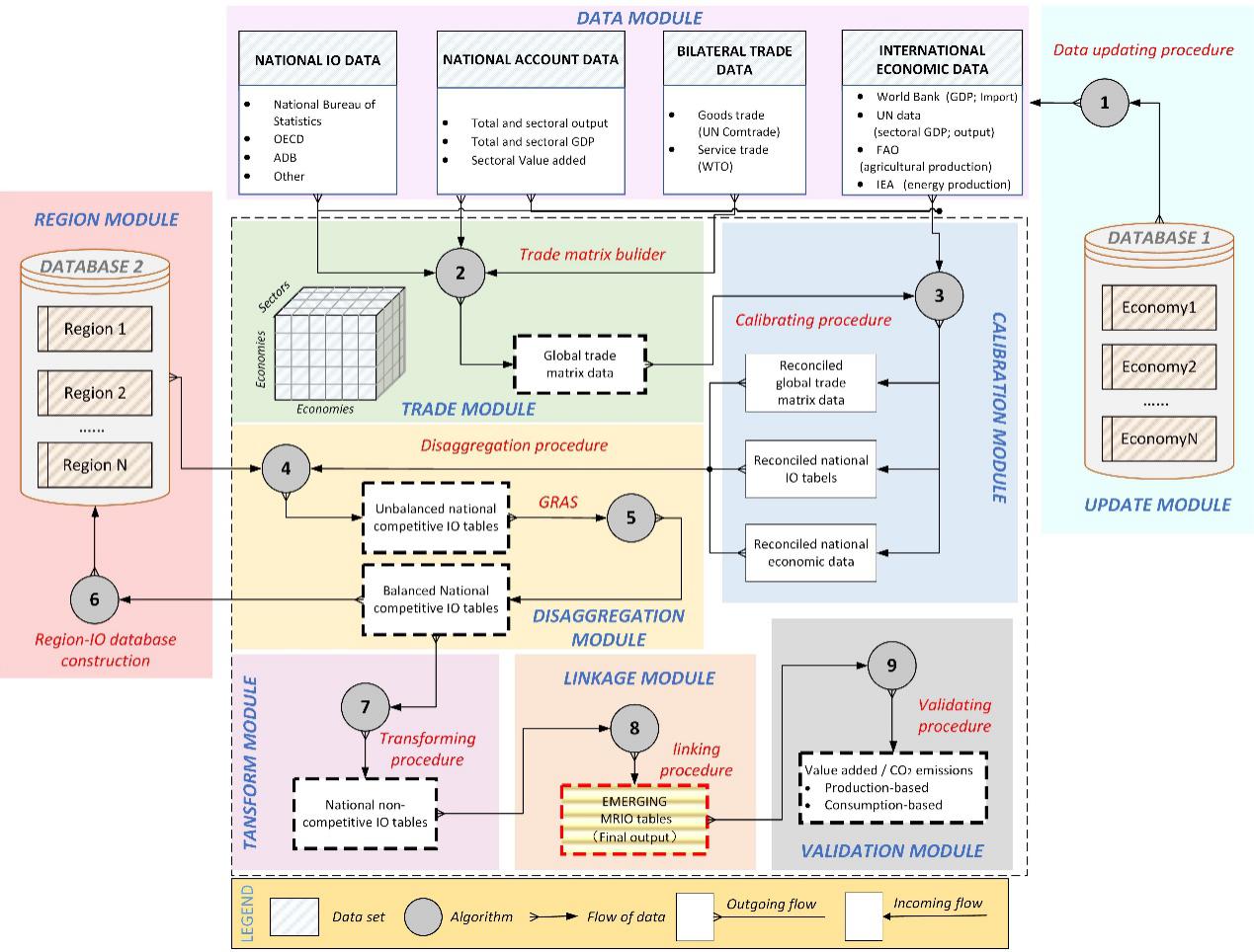 针对上述问题,乐动平台地学系关大博教授研究组联合伦敦大学学院、挪威科技大学、格罗宁根大学和上海财经大学等多家机构学者,创新多源数据融合方法,构建了模块化的全球全区域投入产出模型编制框架(EMERGING MRIO)。EMERGING MRIO是由中国学者领衔研发、具备完全自主知识产权、聚焦于新兴经济体的全球全区域投入产出数据库。与现有数据库相比,EMERGING数据库具有以下5个特点:1.国家分辨率高,全面覆盖了全球所有经济体的经济与贸易信息;2.行业分辨率高,全面反应制造业及服务业供应链的结构变化特征;3.时间覆盖范围广,覆盖了2010年以来的多个历史年份;4.近实时更新,能够反映最新的贸易变化及政策影响;5.采用模块化编译流程,各个模块之间互不影响,减少了各步骤之间的耦合过程,提高了编译效率。