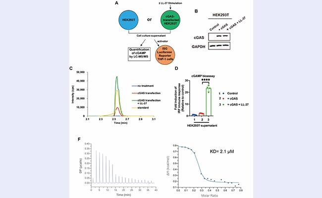 接着,该研究团队通过精妙的细胞间cGAMP转移试验以及ITC、MST等试验发现LL-37通过与cGAMP特异性结合从而对cGAMP进行跨细胞膜运输(图3)。