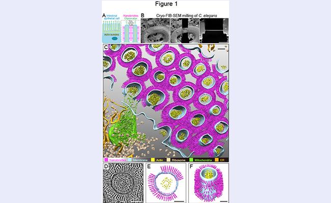 图1.对秀丽隐杆线虫肠道刷状边缘进行原位冷冻电子断层成像实验,发现微绒毛侧表面有纳米毛