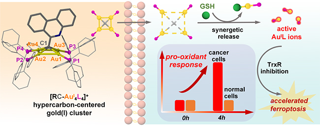 该成果以“超碳金簇前药的协同金释放导致的助氧响应与加速铁死亡”(Pro-oxidant response and accelerated ferroptosis caused by synergetic Au(I) release in hypercarbon-centered gold(I) cluster prodrugs)为题发表于《自然·通讯》(Nature Communications)期刊。