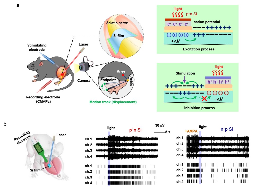 通过微纳工艺制备的图案化硅基薄膜器件,可共形贴附在活体生物组织表面,进行在体生物神经信号的远程光电调控。把硅基二极管薄膜包覆于小鼠的坐骨神经节,通过极性依赖的光生电场,可选择性地增强或者减弱小鼠后肢的运动幅度。把硅基二极管薄膜贴附在小鼠大脑皮层上,产生的光生电场也可相应地激活或者抑制皮层的电活动。