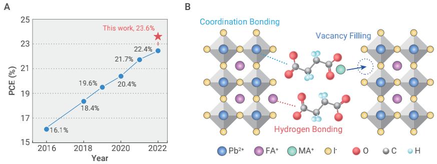柔性钙钛矿电池最高效率发展趋势和添加剂作用机理示意图