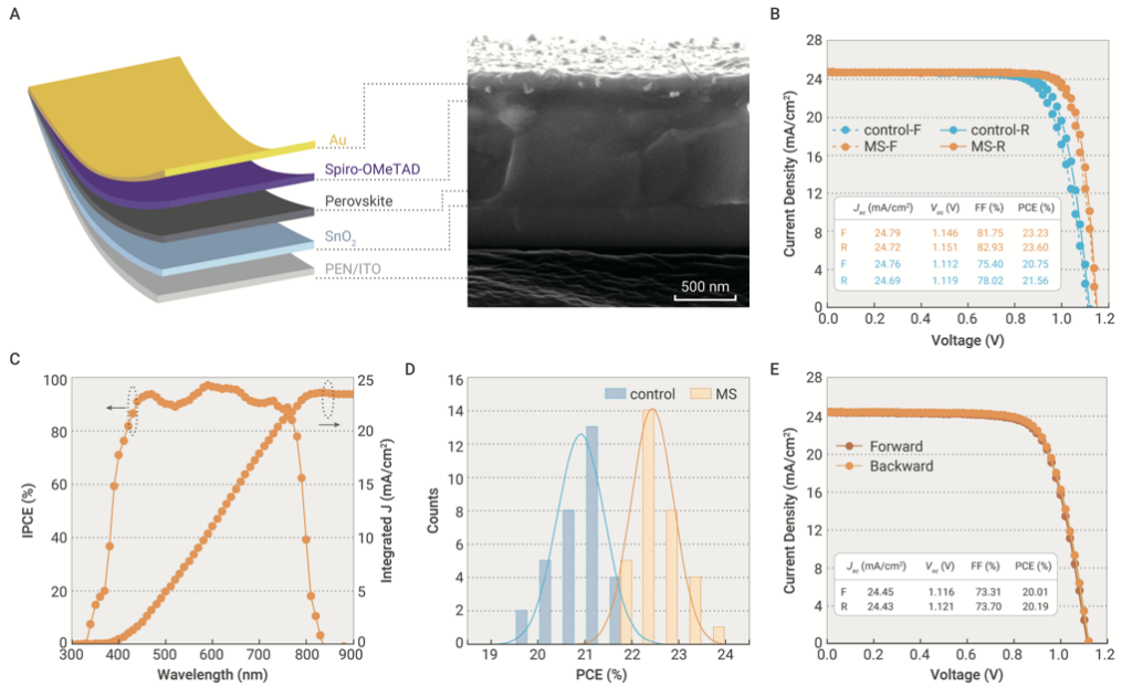 柔性钙钛矿太阳能电池器件结构与光电性能(橙色和蓝色分别为添加剂组和对照组)