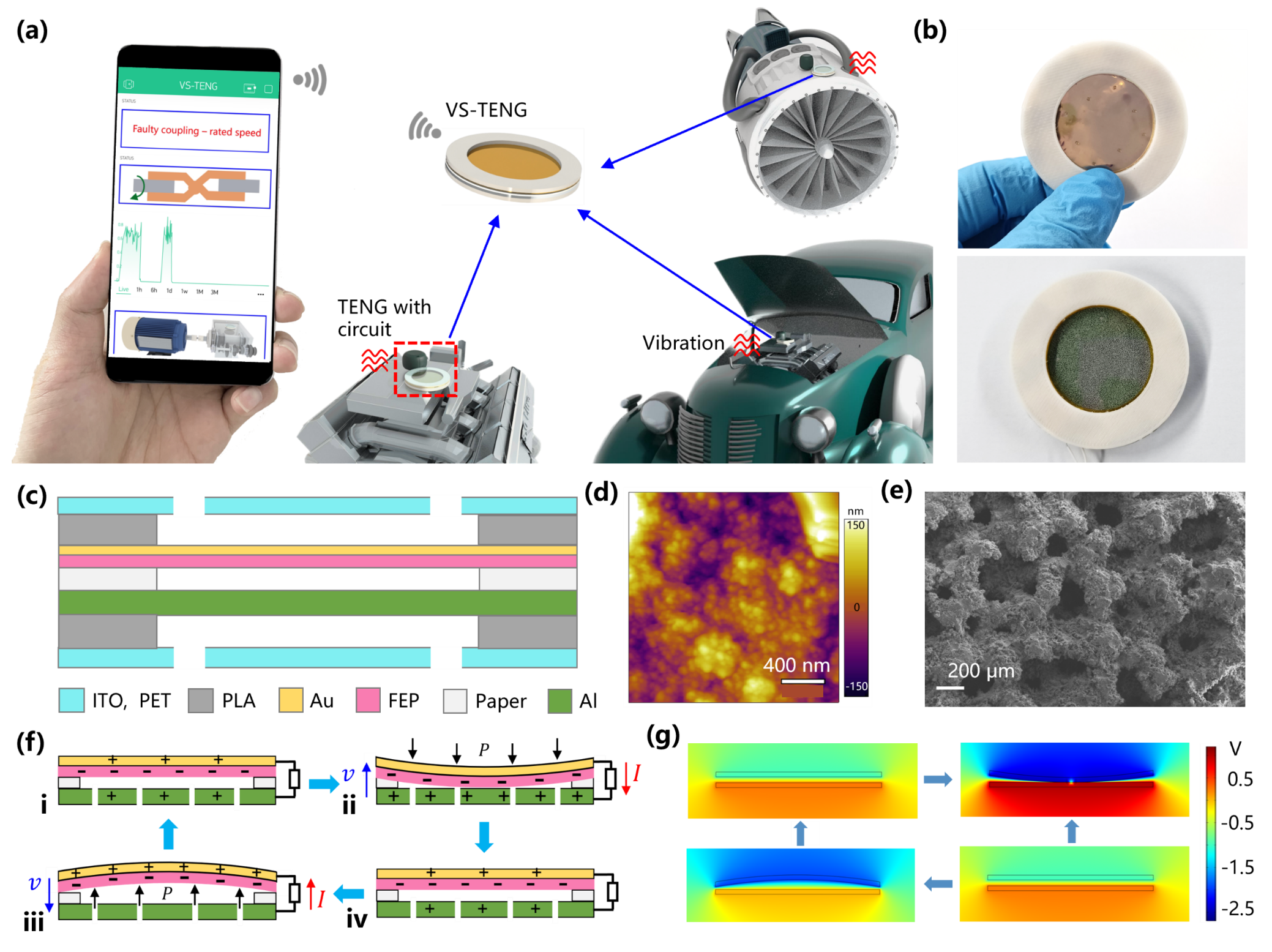 图1. 摩擦纳米发电机振动传感器(VS-TENG)的结构与工作原理