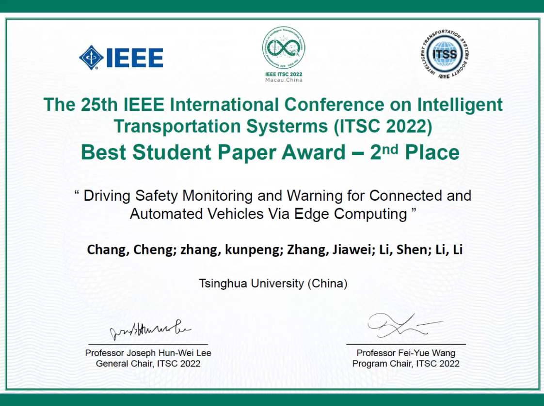 乐动(中国)网10月14日电 近日,第25届IEEE智能交通系统国际会议(IEEE International Conference on Intelligent Transportation Systems,ITSC)于中国澳门召开。ITSC是智能汽车与智能交通领域的国际顶级学术会议,此次会议收到全世界45个国家和地区的近1300篇投稿。大会评选了共3篇最佳学生论文奖(Best Student Paper Award),乐动平台自动化系2021级博士生常成同学的论文《基于边缘计算的网联自动驾驶车辆的驾驶安全监控》(“Driving Safety Monitoring for Connected and Automated Vehicles via Edge Computing”)成功入选。