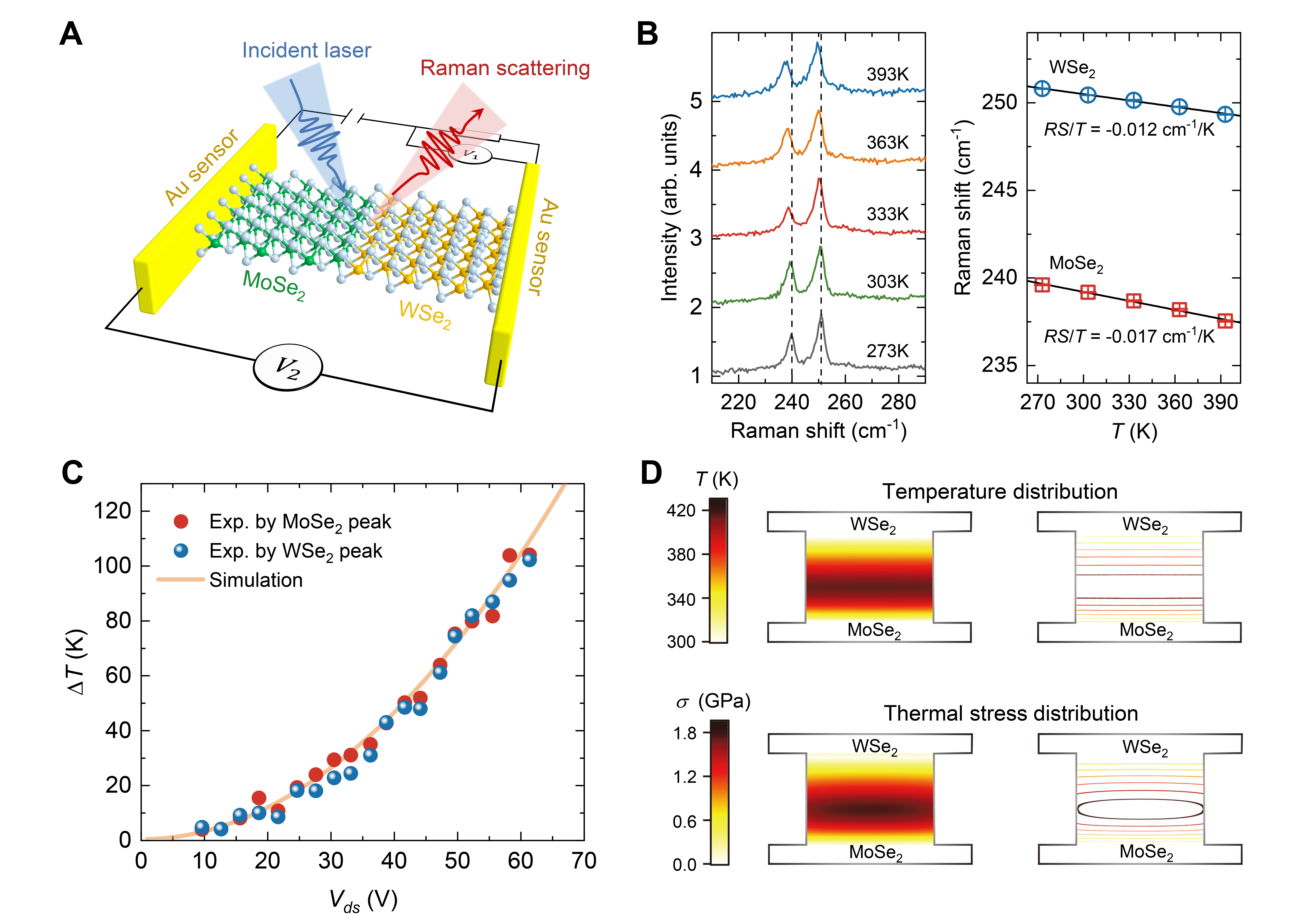 图4. 大偏置电压条件下MoSe2-WSe2异质结器件的界面温升测量