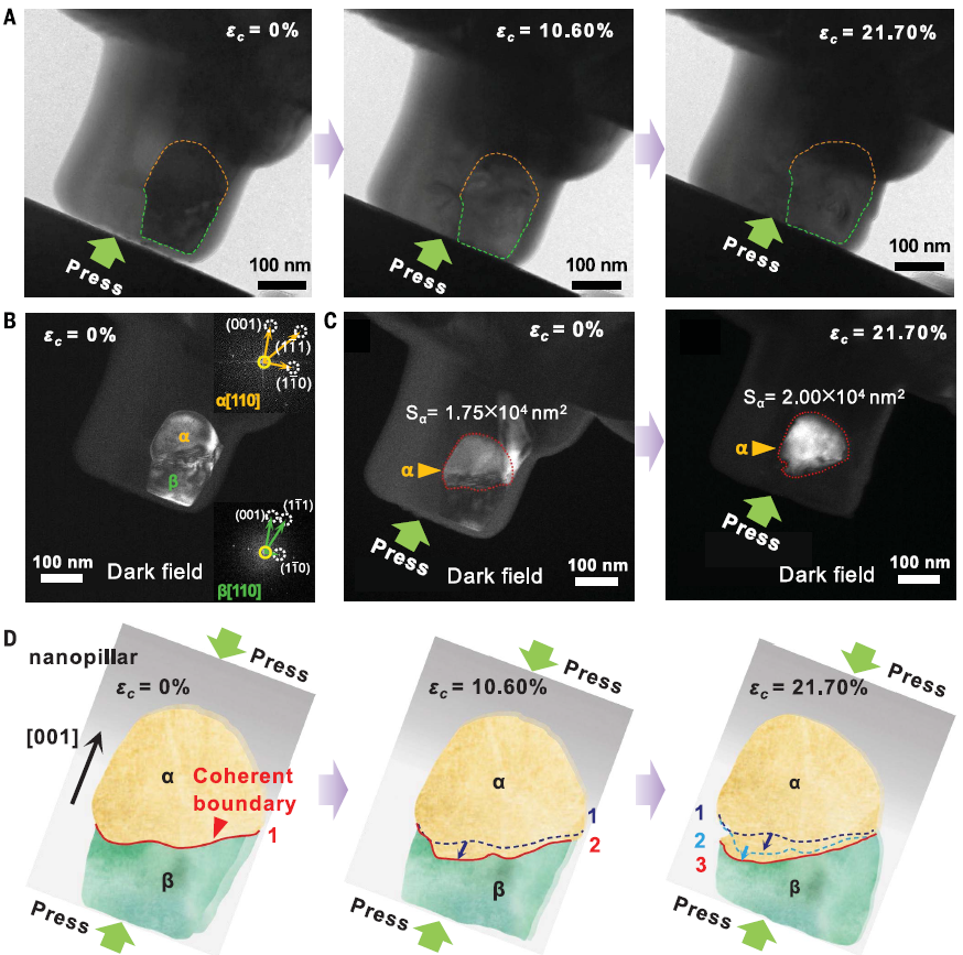 为了研究在外力作用下的结构演变,研究团队分别观察了材料在静态和动态载荷下的变化。结果显示,具有共格结构的氮化硅陶瓷在两种载荷的作用下,均能够发生β→α的相变,这种室温下压力诱导的β→α相变是首次发现。相比之下,不具有共格结构的氮化硅则无法发生β→α相变(图3)。研究团队使用原位透射电子显微镜揭示了这种α/β共格界面在应力诱导的β→α相变中的作用(图4)。