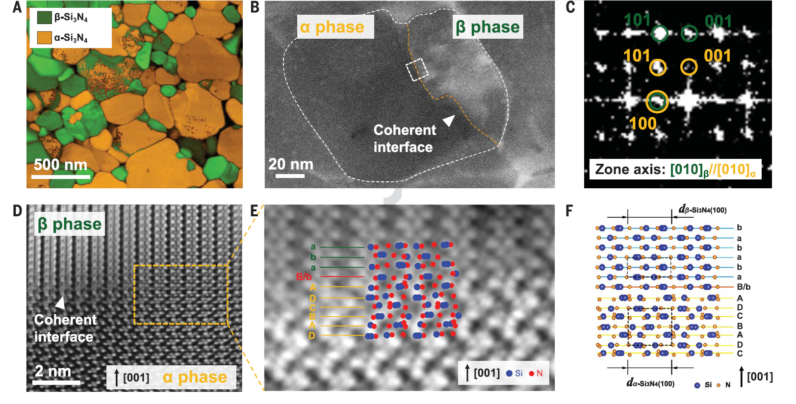 研究团队在氮化硅陶瓷中设计了一种共格界面结构。通过旋进电子衍射(PED)、高角环形暗场扫描透射电子显微镜(HAADF-STEM)、积分差分相位衬度技术(iDPC-STEM)精细表征了共格界面在氮化硅陶瓷中的分布、界面原子结构、晶体取向关系(图1)。
