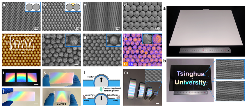 乐动平台机械系汪家道教授课题组在研究中将张力梯度创新性引入到液气界面自组装中,提出了独特的张力梯度诱导纳米颗粒液气界面快速大面积自组装方法。在该研究中,首先建立了基于表面张力与纳米颗粒表面疏水改性的液气界面纳米颗粒松散悬浮构造方法及设计准则。进一步利用负载表面活性剂的凝胶构建液气界面张力梯度,诱发界面对流,打破纳米颗粒间的静电排斥能量壁垒,快速形成密排有序的大面积胶体晶体自组装结构。实验显示了液气界面横向毛细力能够诱导自组装但同时会损害自组装有序性的“双刃剑”作用,提出并证明了基于张力梯度抑制界面毛细团聚作用和提升液气界面自组装质量的有效性,实现了不同尺寸(从400纳米至8微米)、不同形状(球形、花簇状、核壳结构等)微纳米颗粒自组装薄膜在各种基底表面的可控制备。研究基于张力梯度自组装的灵活可持续构建优势,一定程度上解决了纳米颗粒在曲面上的高质量自组装制造难题。研究实现了超1000cm2自组装结构在几秒时间内的超快制备,制造面积和速度相比传统方法提升两个数量级以上,在一定程度上有效解决了大尺寸自组装结构工业化难题。