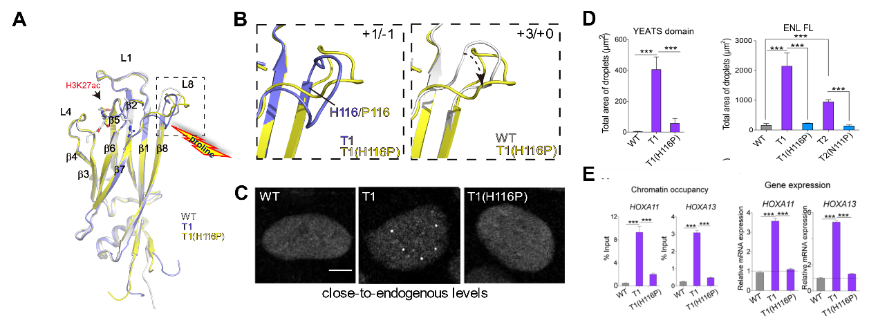 那么这些致癌突变的功能后果是什么呢?为了回答这个问题,研究人员在肾细胞系中表达了与内源水平相近的野生型和突变型Flag-ENL。在内源表达水平下,ENL突变体(T1-T8)可以形成亚微米级(~400 nm)的凝聚体,而且这些凝聚体与靶基因(e.g., HOXA11/13)的新生RNA共定位。与野生型相比,肿瘤突变增加了ENL在靶基因处的富集并增强了其转录活性,进而导致肿瘤发生。有趣的是,研究人员在β8末端重新引入一个脯氨酸,从而在突变体YEATS中重构了“脯氨酸凸起”障碍。体外和体内实验也发现这一微小突变几乎彻底消除了肿瘤突变引起的凝聚体以及靶基因过表达。这些结果首次表明蛋白“有序”结构域的癌症突变可以诱导异常凝聚体在体内形成,并揭示出ENL YEATS的“脯氨酸凸起”结构基序在抑制癌症发生中的重要作用。
