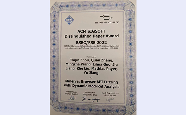 乐动(中国)网11月17日电 11月14日至18日,第30届国际计算机学会(Association for Computing Machinery,简称ACM)软件工程基础国际会议(The ACM SIGSOFT Joint European Software Engineering Conference and Symposium on the Foundations of Software Engineering, 简称ESEC/FSE)在新加坡召开。乐动平台软件学院姜宇副教授课题组的论文“基于动态写读关系分析的浏览器API测试”(Minerva: Browser API Fuzzing with Dynamic Mod-Ref Analysis)获得杰出论文奖(Distinguished Paper Award)。