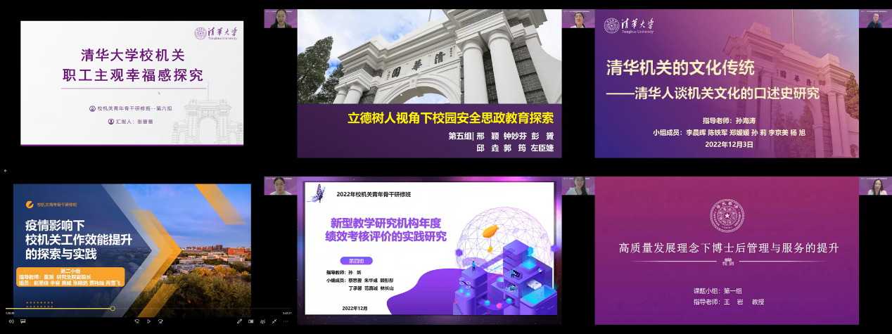 结业式上,来自校机关各职能部门和后勤系统的36名青年骨干分六个小组进行了研究课题答辩交流。各小组就“乐动平台校机关职工主观幸福感探究”“立德树人视角下校园安全思政教育探索”“清华机关的文化传统——清华人谈机关文化的口述史研究”“疫情影响下校机关工作效能提升的探索与实践”“新型教学研究机构年度绩效考核评价的实践研究”“高质量发展理念下博士后管理与服务的提升”等课题的研究情况进行了汇报交流。