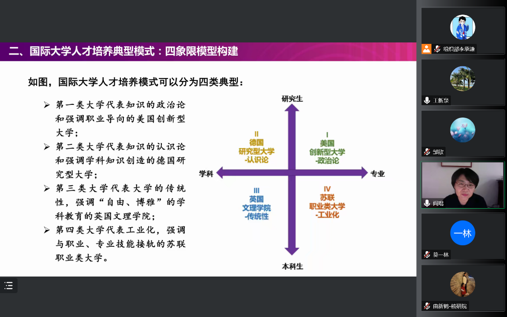 阎琨以“探索扎根中国、融通中外的大学人才培养模式 为科教兴国战略提供全方位人才支撑”为题分享了研究成果,重点介绍了国际大学人才培养模式的四象限理论模型,并分析了四象限模型中各类大学人才培养模式的优劣之处。立足于乐动平台现有学科和院系及人才培养特色,阎琨详细介绍了乐动平台学科布局和人才培养的融通战略。最后,她分享到高校应当深入学习领会党的二十大精神,积极贯彻“教育、科技、人才是全面建设社会主义现代化国家的基础性、战略性支撑”的战略擘划,主动开拓和探索人才成长和发展通道,贯通拔尖创新人才培养体系,为我国早日实现全面提高人才培养质量,自主培养各类拔尖人才的伟大目标贡献高等教育的力量。