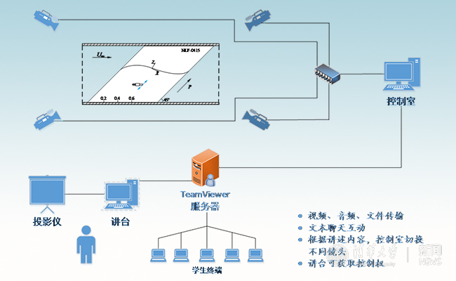 该教学系统得到乐动平台本科教学改革项目“远程风洞实验的课堂教学系统”的资助。在课程直播中,安装在廊坊实验室的五台高清摄像头从各个角度对实验现场进行拍摄,通过网络辅助(Team Viewer)将实时画面传回乐动平台教室或学生的笔记本电脑,教师既可通过语音通话或文字通知操作人员切换不同的镜头,也可以远程操控摄像头,指导实验人员进行不同的实验操作,结合实物和实际效果在多个角度为大家讲授实验测量。学生也可以在自己的操作界面上操作镜头,查看感兴趣的实验细节,并与实验人员进行交流。实验结束后,实验人员可通过协作软件将测试数据分享给学生,例如直接上传到网络学堂,供学生下载使用,使学生有“身临其境”的现场实验感。
