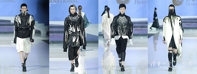 本届“汉帛奖”大赛主题为“留白”,留白是中国传统文化一种特有美学象征;是以“空白”为载体进而渲染出美的意境的艺术。韩晓英的设计作品《墨韵》灵感来自墨西哥瓦哈卡的黑陶制作工艺,借鉴黑陶镂空工艺和民间镂空花卉图案,结合中国书法所表现的水墨留白韵味,塑造古朴、沉稳的现代男装。作品中的材料与图案设计别具创意,面料背景用墨渲染的效果体现浓淡相宜的整体层次,镂空花卉图案以不对称的位置摆放突出个性。