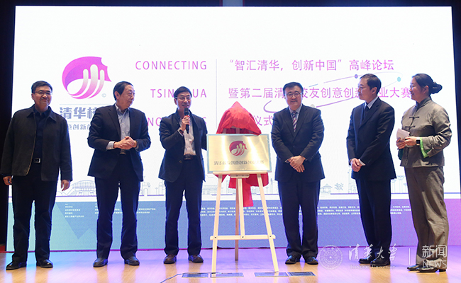 副校长杨斌、校友总会秘书长唐杰、同方股份首席运营官李健航、清华大数据产业联合会会长韩亦舜、同方科技员总经理田东海一同为第二届清华校友三创大赛启动揭牌。石加东 摄