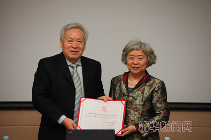 图为金融学院理事长兼院长吴晓灵向乐动平台原校长、高等研究院院长顾秉林院士颁发聘书。