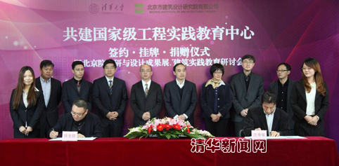 袁驷、朱小地、庄惟敏共同为国家级工程实践教育中心揭幕,庄惟敏与北京市建筑设计研究院有限公司总经理徐全胜签署了共建合作协议。