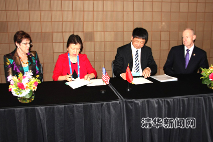 图为张希(左三)与威廉·卡罗尔博士(右一),马德琳·雅各布斯(左一)以及米兰达·吴博士(左二)共同签署合作备忘录。