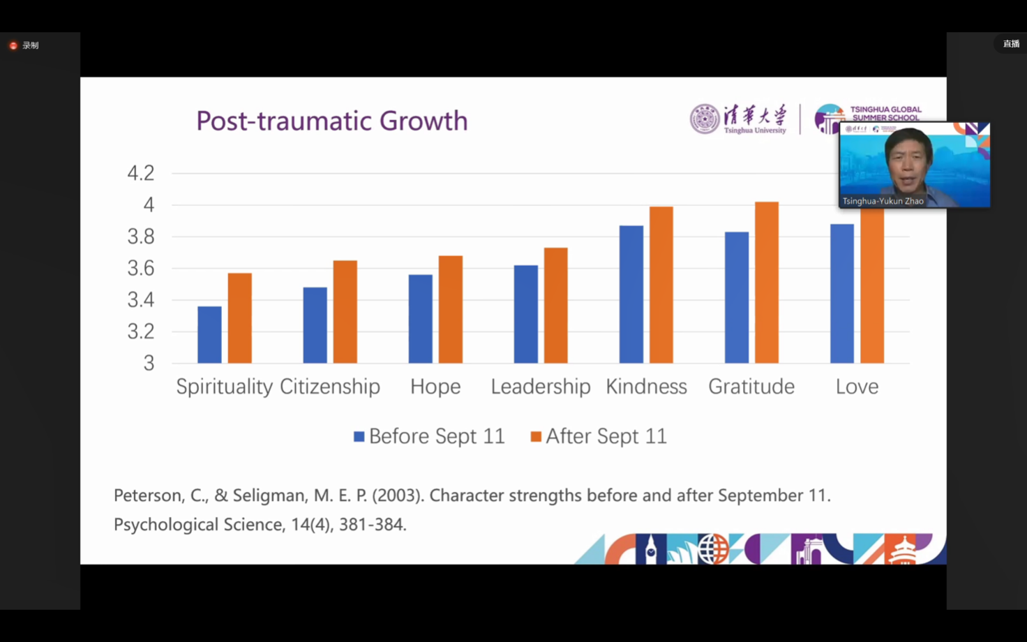 北京时间晚9点45分, 由幸福科学实验室副主任赵昱鲲博士主持的关于“创伤后成长”的在线研讨会为当日课程画上句号。赵昱鲲首先回答了积极心理学相关问题,然后介绍了创伤后成长(Post Trauma Growth,PTG)的概念——虽然创伤后应激障碍(PTSD)为公众所熟知,但实际上有更多的人在创伤事件后经历过创伤后成长(PTG)。新冠肺炎疫情在一些高危人群中导致了更高程度的抑郁、焦虑,甚至可能是创伤后应激障碍,但研究者也观察到了大量疫情后的成长现象。根据赵昱鲲博士和其他学者的研究,中国人在疫情后表现出了更高水平的人格力量和意义感,同时也有更多的利他主义倾向。