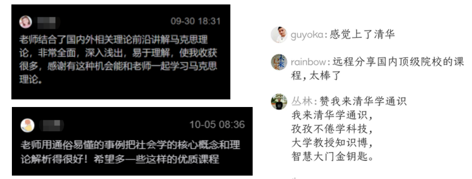 课程受到广大学习者们的欢迎,大家纷纷表示非常兴奋能够有机会学习清华的课程。“老师以小见大、由浅入深地讲解,让学生了解了很多分析国际事件的方法和视角,能够更理性地看待各种政治事件了。”“老师的讲解深入浅出,把马克思的个人性格剖析得非常全面,为对其思想的深入了解打下基础,真的是举重若轻。”“在泰坦尼克号海难中获救人群女性和乘客占比之大完全颠覆了自身对当时社会的认知,理性的推论反而和事实相反,更加引发深思,一些僵化的定论有了改变,期待继续学习下一期清华通识课程。”在线学习者们在三门课程的讨论区纷纷留言发表了自己的学习心得。