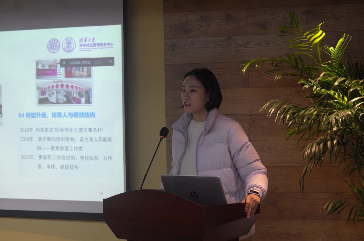 学生社区管理服务中心国际学生公寓事务科副科长王明璇以“社区育人工作的探索与思考”为题进行分享。她表示,在三全育人工作中,公寓实施了六项建设,取得了良好的效果。其中队伍建设是关键,体制建设是前提,机制建设是保障,文化建设是落脚点,内容建设是核心,环境建设是外在重要的表现形式。