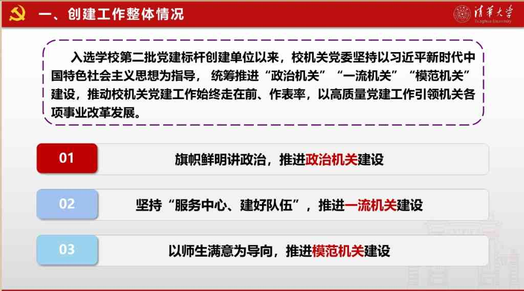 结合高质量党建引领高质量发展,围绕进一步做好创建工作,许庆红强调了三方面要求。一是要深刻理解、贯彻落实上级党组织和学校党委新要求。党的二十大报告指出要增强党组织政治功能和组织功能,把各级党组织建设成为有效实现党的领导的坚强战斗堡垒,教育部“对标争先”建设计划对院系党委提出“五个到位”的要求,学校第十五次党代会提出高质量发展“八个必须”的要求,明确了从把方向、管大局、作决策、抓班子、带队伍、保落实六个方面加强党对学校事业的全面领导。上下贯通、执行有力的组织体系是清华党组织的优良传统,中央有要求、学校有决定,二级单位坚决执行到位充分体现在学校事业发展和疫情防控等重要工作当中,作为创建单位要深刻认识领会上级党组织提出的新任务新要求,持续提升政治功能,发挥组织优势,把党的全面领导贯彻落实好,切实发挥战斗堡垒作用。二是要充分突出本单位特色。创建工作要体现目标导向,紧密结合中心工作、立足于本单位特点开展,实现党建质量提升。同时要体现问题导向,结合事业发展面临的新形势新挑战,在组织模式、工作机制、工作力量等方面做出调整优化,在继承发扬党组织优良传统的同时,主动创新党建工作形式和载体,增强工作实效,以高质量党建推动事业高质量发展。三是要注重经验总结和制度建设,形成长效机制。高质量党建永远在路上,要发挥全国党建示范高校和标杆单位的“旗帜”“标杆”作用,在健全机制、建立制度上下功夫,把创建过程中探索形成的好做法、好经验固化成为制度和工作品牌,要以多种方式加强校内外经验交流和推广,切实发挥典型示范作用,引领带动全校党组织共同进步、全面过硬。