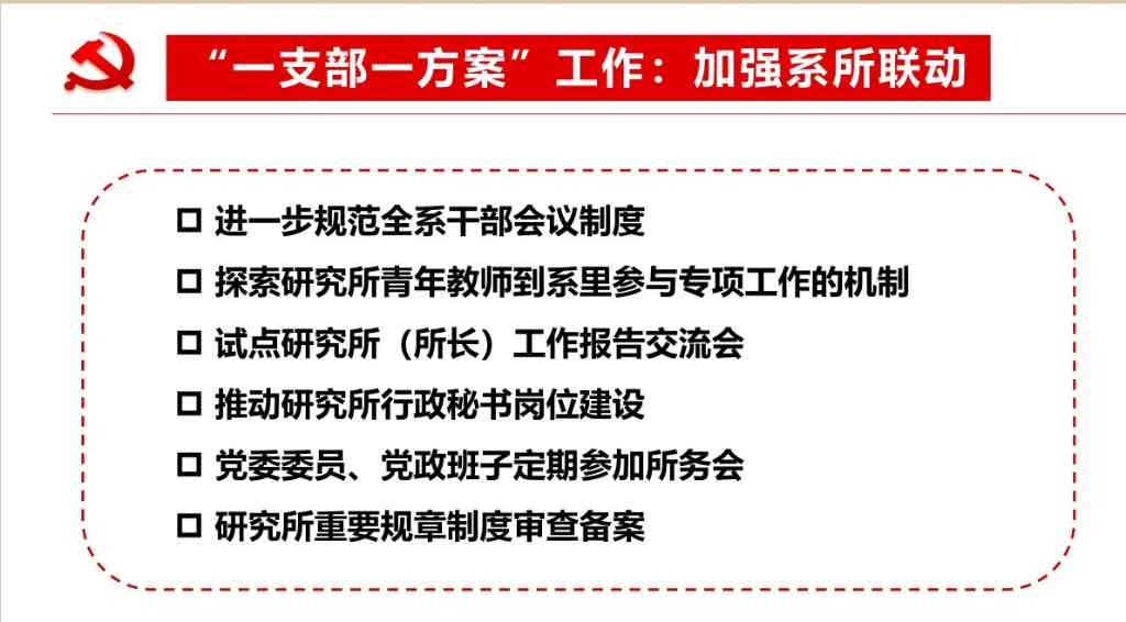 张佐结合创建工作计划,介绍了自动化系党委以各研究所、党支部面临的困难与挑战为出发点,通过“一支部一方案”的方式实现进一步加强系所联动、规范运行机制、落实党政协同、促进学科建设的目标。通过建强基层党支部,建立研究所、党支部协同发展机制促进基层组织制度执行到位,夯实党的全面领导的组织基础。