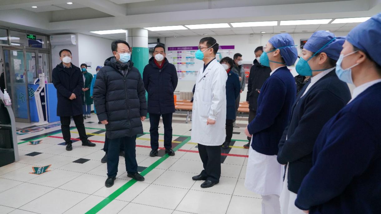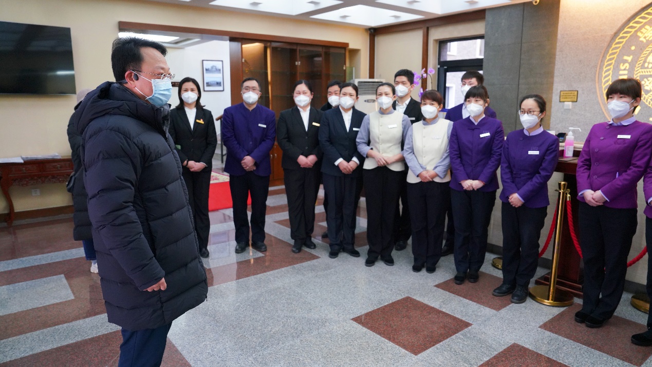 在甲所宾馆大厅,王希勤代表学校向大家拜年,对大家坚守工作岗位、为疫情防控付出的努力表示感谢。在街道服务楼和校医院,王希勤向过去三年里奋战在疫情防控一线的街道工作者、医务人员致以诚挚的问候,感谢大家在维护清华师生生命健康、保障清华园安全稳定和安定祥和欢度佳节等方面付出的辛勤努力和作出的重要贡献。