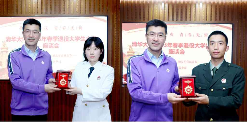 座谈会上,过勇为退役大学生士兵代表颁发清华士兵纪念章。