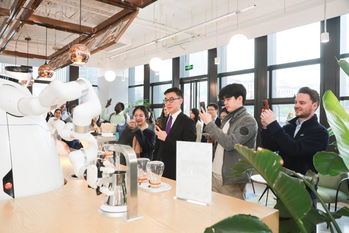 在重庆市两江新区科创园参观,体验咖啡机器人制作流程