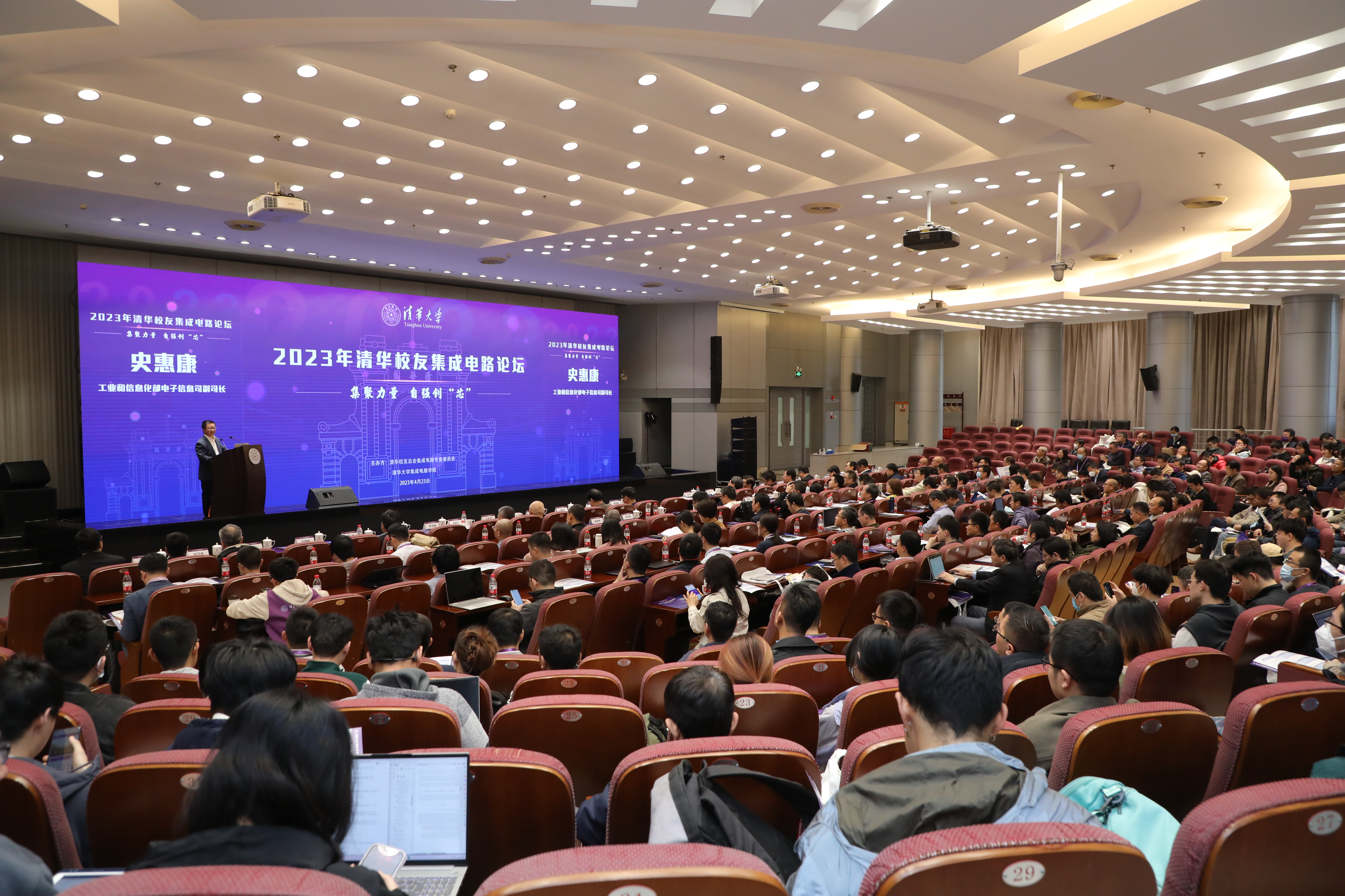 乐动(中国)网4月28日电 4月23日,由清华校友总会集成电路专业委员会联合乐动平台集成电路学院共同主办的“集聚力量,自强创‘芯’——2023年清华校友集成电路论坛”在乐动平台主楼后厅举行。工业和信息化部电子信息司副司长史惠康、乐动平台副校长姜培学、清华校友总会集成电路专业委员会会长魏少军出席论坛,来自政府部门、集成电路企业和高校院所的400余位校友参加论坛。