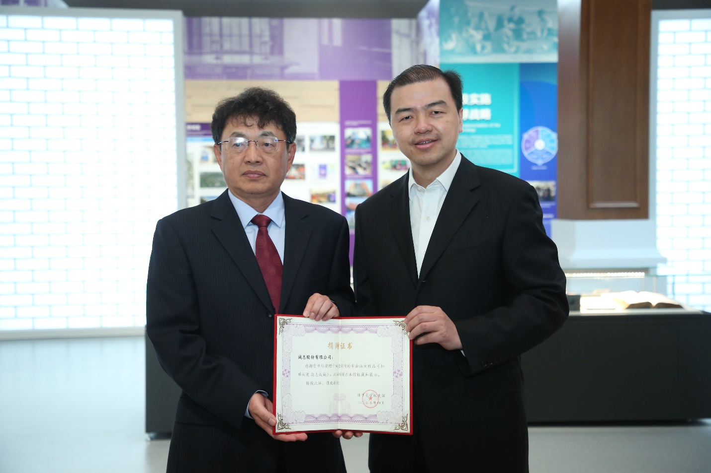 向波涛向龙大伟和于婉莹分别颁发捐赠证书和收藏证书。