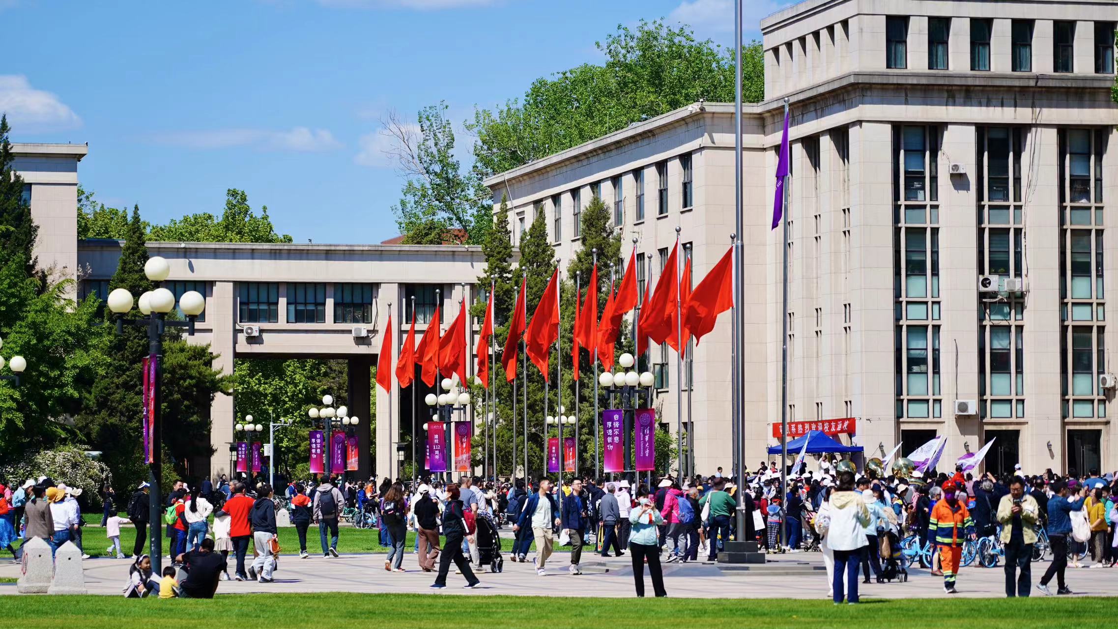 “欢迎校友回家!”“欢迎回家!”……4月29日、30日,雨后的清华园,天空高远瓦蓝,紫荆花竞相绽放,草木也悄然披上新衣,崭新的道旗迎风招展,盛装拥抱每一个归家游子。二校门、大礼堂、学堂路、西操场……热闹非凡的清华园,处处洋溢着重逢的喜悦。