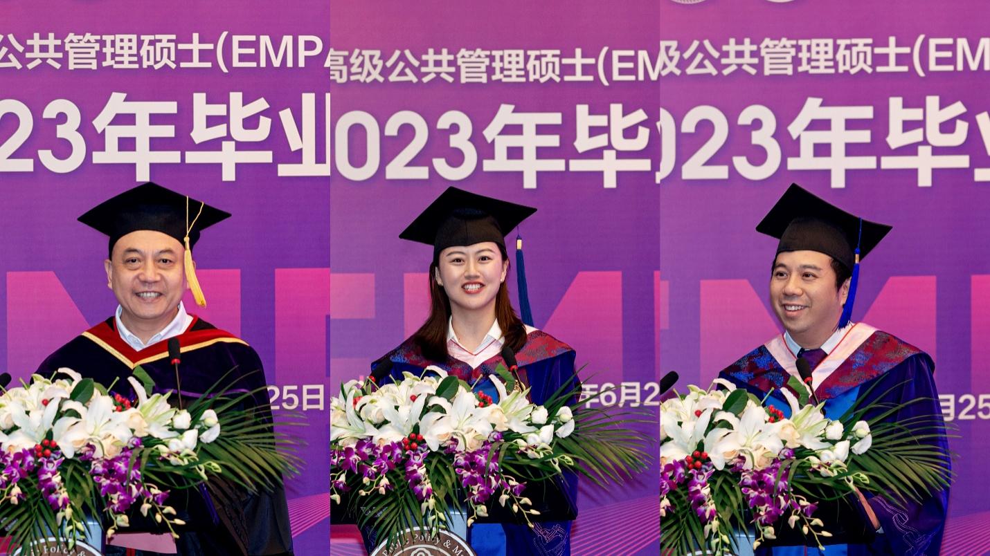 EMPA项目授课教师代表齐晔、优秀毕业生奖学金获得者代表邢文威、往届毕业生代表杨文锐分别发言。