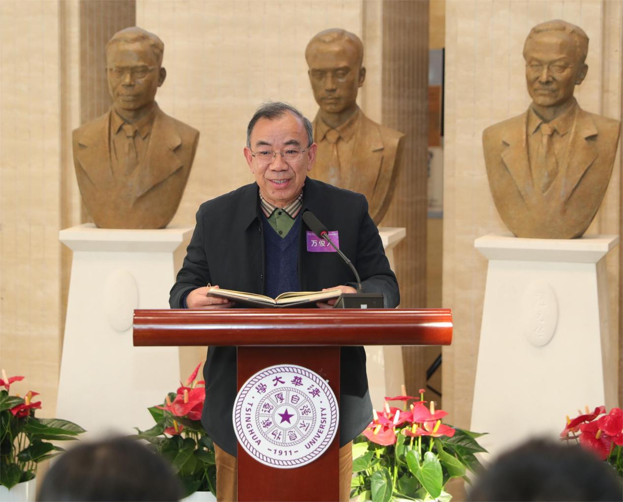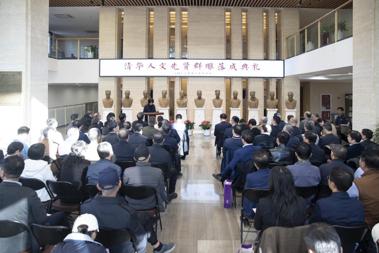 人文学院院长刘石对支持群雕落成的各方表示感谢。他表示,梁启超、王国维、陈寅恪、赵元任、吴宓、金岳霖、冯友兰、蒋廷黻、朱自清、闻一多、雷海宗等11位人文先贤的雕像在人文楼前厅落成,对于刚刚踏上新十年征程、即将与社科学院共同纪念原人文社会科学学院成立30周年的人文学院来说具有特别的意义。学院用群雕的方式表达对清华人文先贤的致敬,也是表达对从传统向现代转型中为中国现代人文学术作出伟大贡献的前辈学人的致敬。在前辈大师深邃而温暖的目光凝视下,人文学院的全体师生必将从先贤身上获得更大的精神感召,汲取更多的学术滋养。
