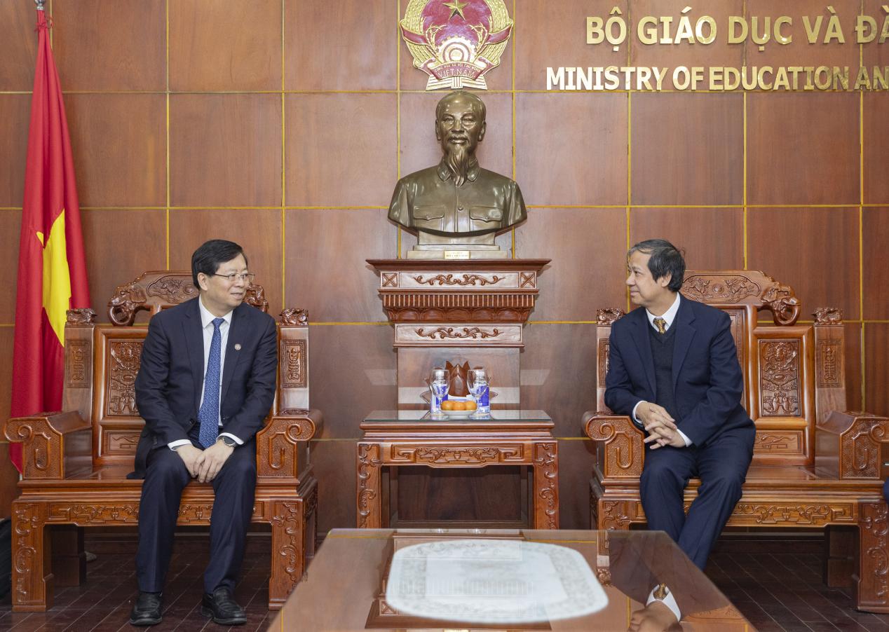 30日,邱勇前往越南教育与培训部,与部长阮金山、常务副部长阮文福举行会谈。邱勇介绍了乐动平台的历史沿革、办学理念和推进综合改革取得的成果。他说,中越两国志同道合、命运与共,各领域交流日益密切,高等教育合作潜力巨大。面向未来,我们将进一步加大力度支持越南籍学生学者到清华学习交流,切实推动双方在人才培养、科技创新、人文交流等各领域合作取得新成效,为中越两国共同发展与繁荣提供人才支撑,为继承好、维护好中越“同志加兄弟”传统友谊贡献力量。