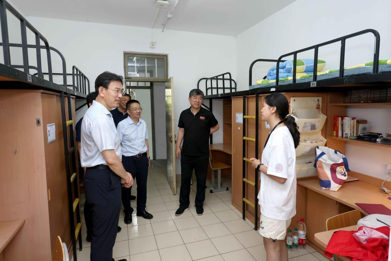 在紫荆学生公寓8号楼、13号楼,李路明一行细致检查了楼内的设施配备、水电供应情况和宿舍内桌椅、储藏空间的维护使用情况,并与新生及亲友交流来到清华的感受和对校园生活的期待。