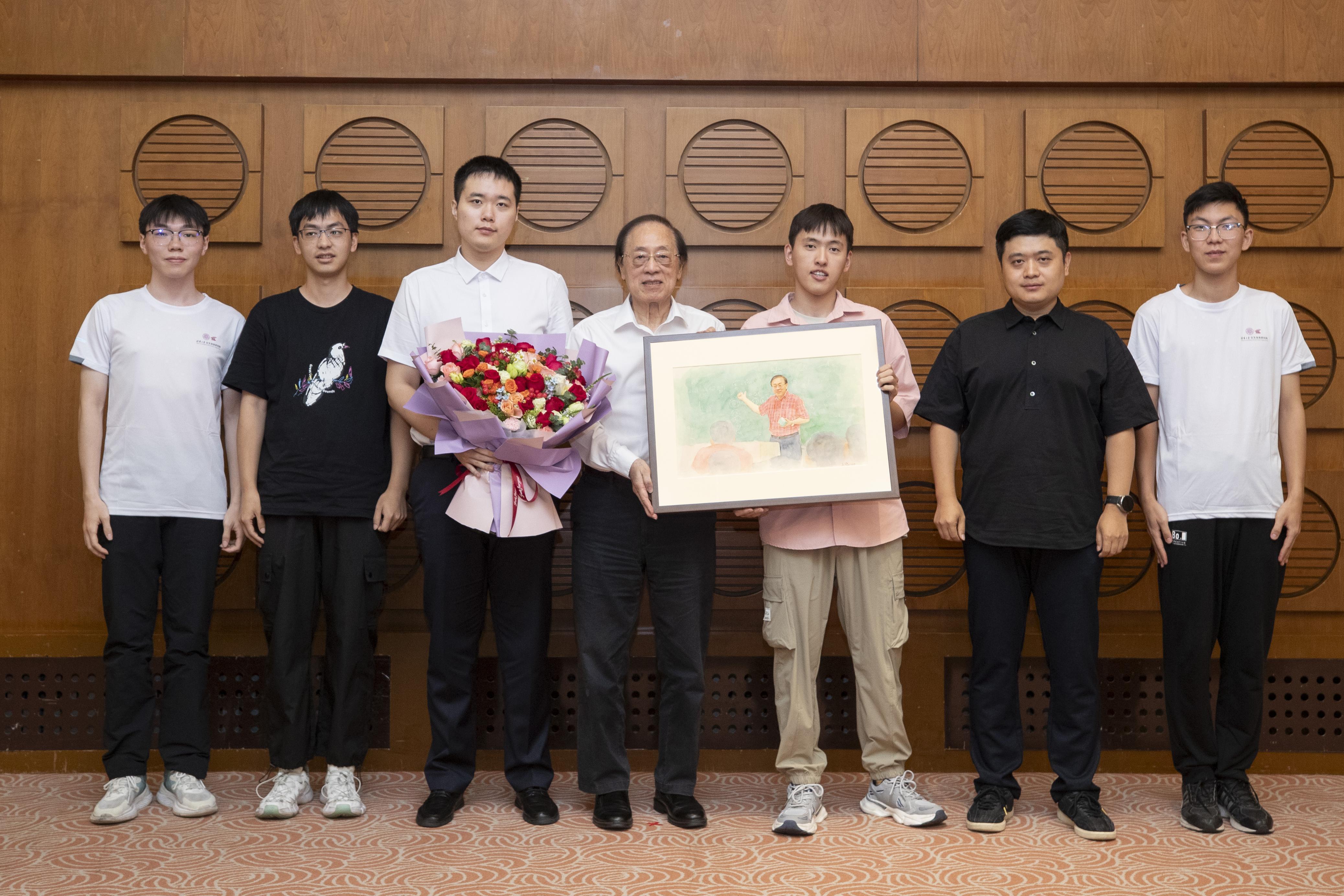 座谈会上,学生代表为姚期智先生献花并赠送画作。
