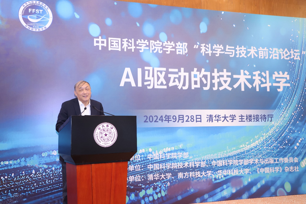 姜培学作为执行主席代表发言,强调了人工智能在技术科学领域的重要作用,并提出了对能源消耗问题的关注。