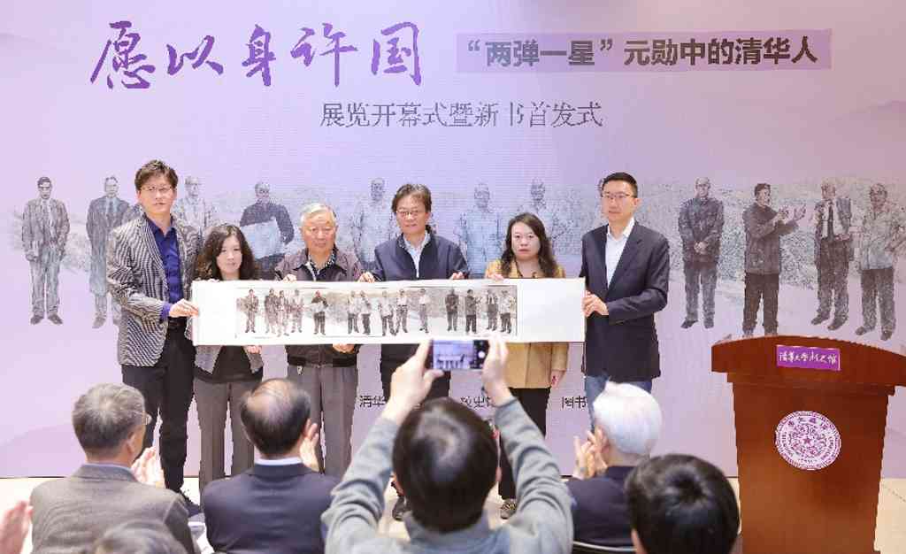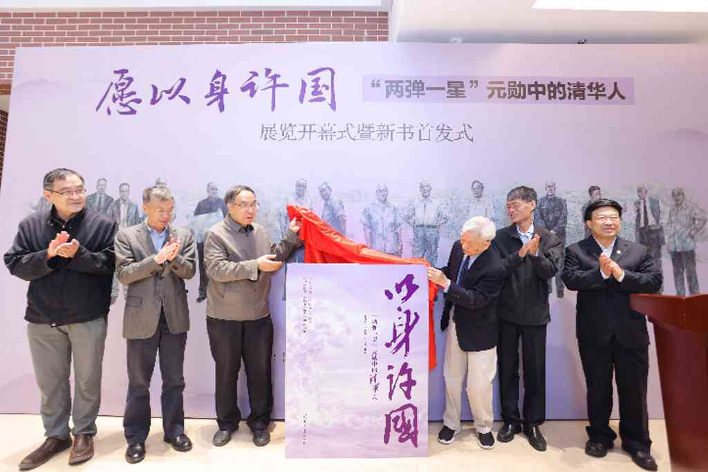 史宗恺,葛能全,乐动平台校史编委会委员、出版社党委书记、董事长邱显清,科学技术史暨古文献研究所教授、本书主编冯立昇,校史编委会副主任、校史研究室原主任、档案馆原馆长、本书主编范宝龙,物理系原党委书记、粒子物理核物理与天体所所长王青共同为《愿以身许国——“两弹一星”元勋中的清华人》新书首发揭幕。