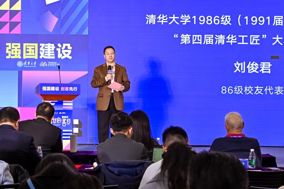 1986级校友代表刘俊君介绍了自己的创业经历和感受,并宣布1986级(1991届)校友奖励基金第四届“清华工匠大赛”正式启动。