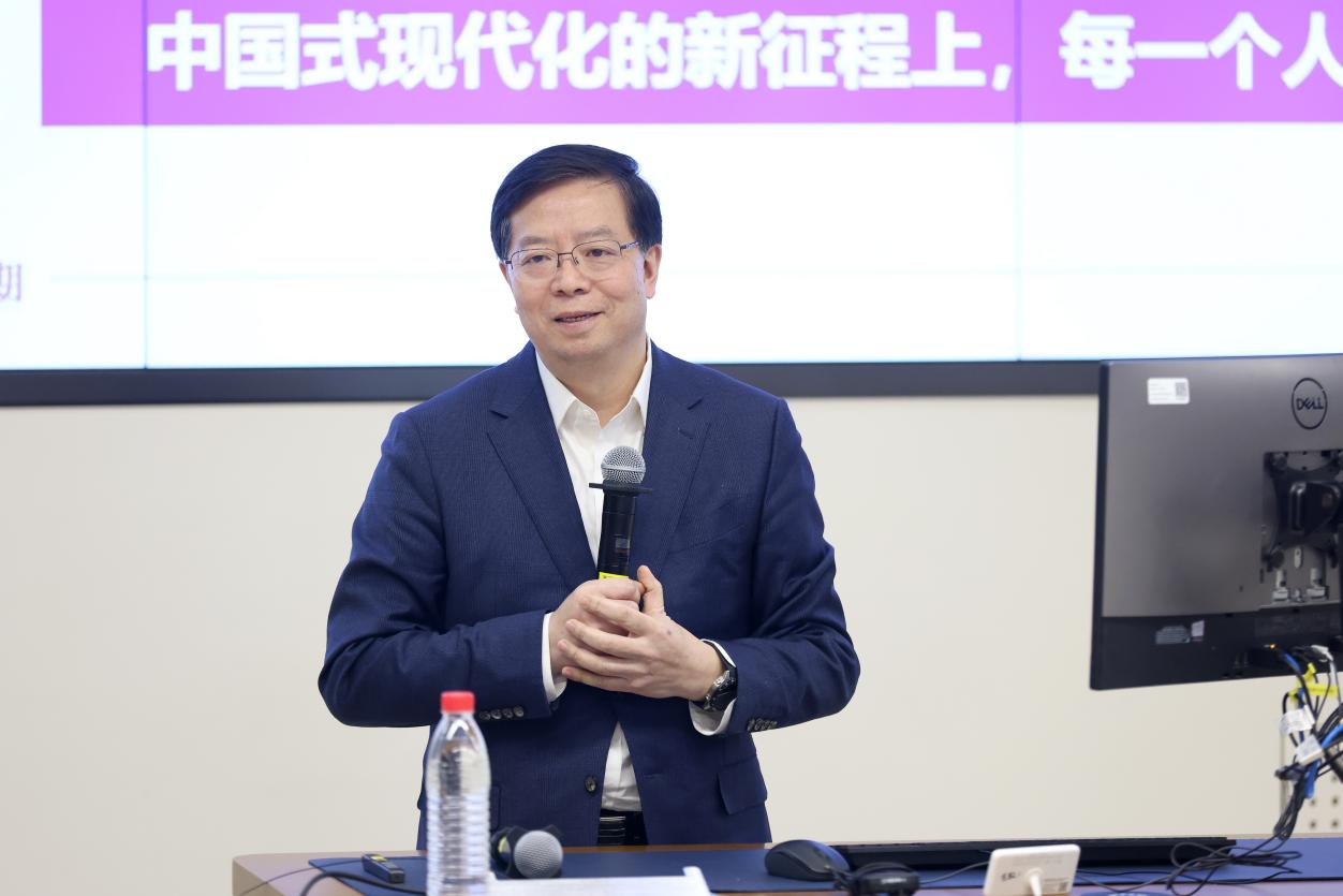 “形势与我何干?”课程伊始,邱勇从当前国际国内形势切入,引导同学们冷静客观地认识和分析所面临的形势,并强调,中国式现代化的新征程上,每一个人都是主角,新时代中国青年更要把握历史机遇、担负时代使命。