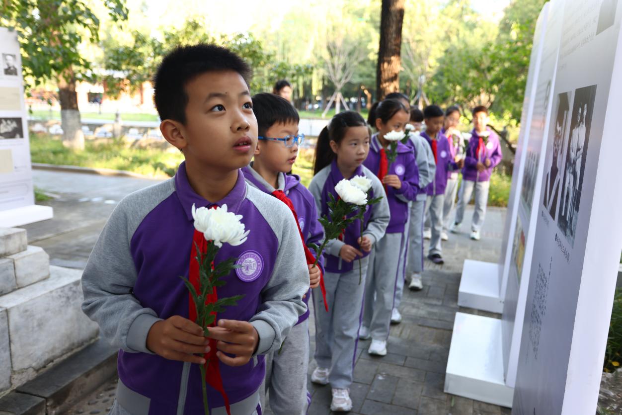 师生依次在纪念碑前鞠躬、献花,表达对英烈的崇高敬意与无限追思。