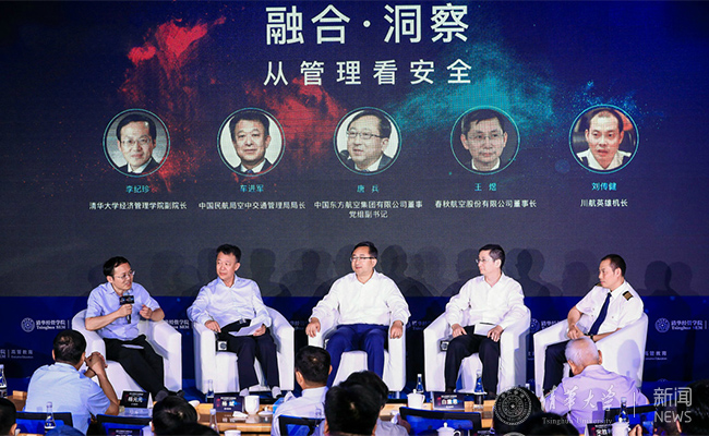 在圆桌论坛环节,中国民航局空中交通管理局局长、清华经管2014级校友车进军,中国东方航空集团有限公司董事、党组副书记、清华经管2006级校友唐兵,春秋航空股份有限公司董事长王煜,川航英雄机长刘传健围绕“融合·洞察:从管理看安全”主题,结合民航业从业经历,分享了对民航安全、行业管理和智慧民航发展的认识,并对未来“智慧民航”场景进行了展望。