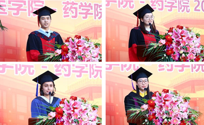 典礼上,李忠持、古丽丹娜·沙艳、迪皮卡(Rana Deepika)、李瑞洋四位同学分别代表毕业研究生、八年制医学实验班毕业生、国际公共卫生硕士毕业生和毕业本科生发言,他们感谢母校和医学院、药学院的培育之恩,表示毕业后仍将不忘初心,深耕在各自的领域,为建设健康中国贡献力量。
